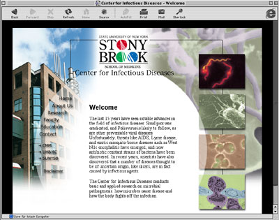 My latest project is the homepage for the Center of Infectious Diseases at the State University of New York (SUNY) at Stony Brook. The homepage contains many graphical elements and is different from my previous work in so far as it tries to get away from the conventional design with a title bar and navigation bar as the only graphical elements. The text is centered in what is more a collage of different images representing the Center than a regular web site. It is also different because the background color is no longer plain white, but black, setting a contrast to the text part and giving the impression of a page sitting on a black background giving the whole appearance more depth. |