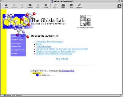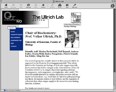 Due to my engagment for the department homepage I had the opportunity to design several homepages for faculty members (Prof. Ghisla, Prof. Ullrich) of the Department of Biology at the University of Konstanz. Here it was necessary to find the balance between an individual presentation of the faculty member and the integration of the homepage in the design concept of the departmental web site. |